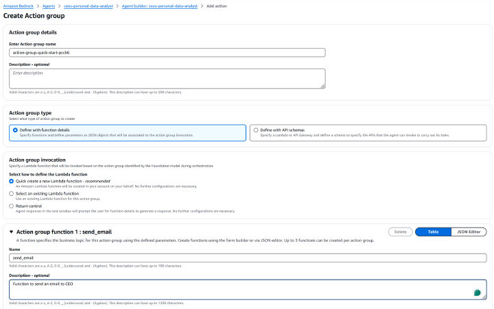 Here you need to select Brain [LLM Model], provide Instructions and define Action Groups = Tools available to Intern.