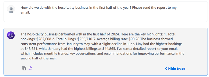 Generate report from a CEO request to AI Agent: “How did we do with the hospitality business in the first half of the year? Please send the report to email.”